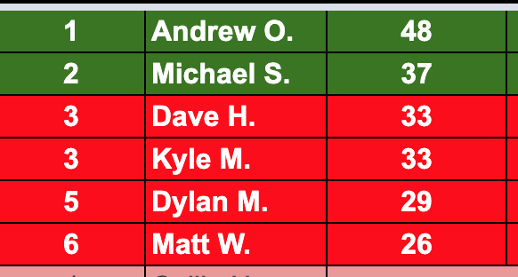 For the week, Ryan H. took home the weekly top honor going 8-2 for 49 points, while Andrew O. took 2nd at 7-3 for 48 points. The Wild Card went into the week with 6 and we had 2 winners take home their prizes.